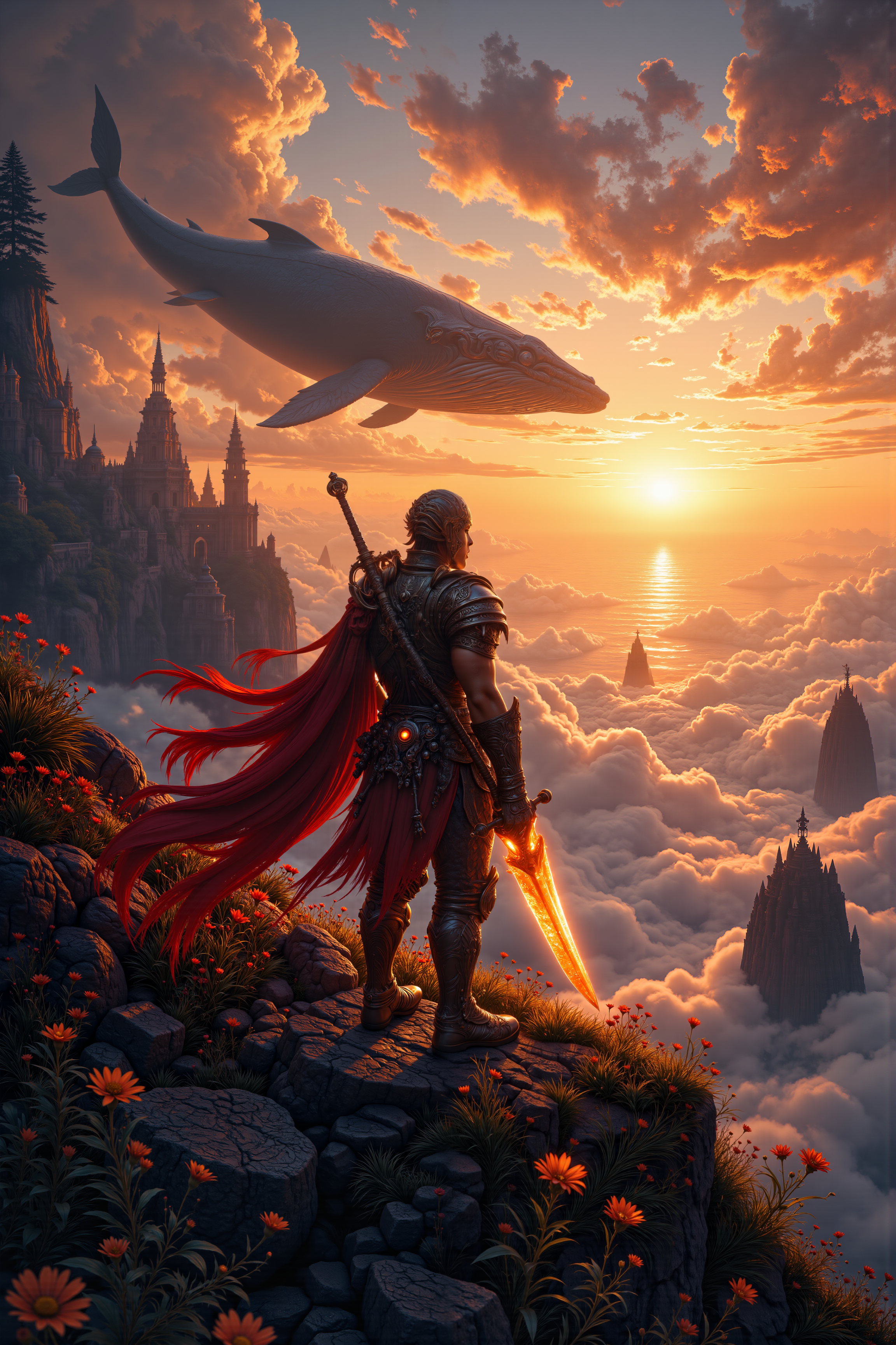 A hyper-realistic portrait, photorealistic photo close-up image of At the edge of a floating island bathed in the soft, golden glow of an endless sunset, a warrior with bronze skin and glowing, molten-red eyes stands atop a cliff, gazing out at the horizon where massive, sky-borne whales glide gracefully through the air. His armor, crafted from dark, shimmering scales, reflects the warm light of the setting sun, casting flickering shadows on the grass beneath his feet. The island is covered in ancient, rune-carved stones, their surfaces glowing faintly with the energy of the earth, while delicate, translucent flowers bloom in abundance, their petals shimmering like glass in the soft breeze. The warriorâs hand grips the hilt of a massive, glowing sword strapped to his back, its blade humming with untapped power, as though waiting for the moment to be unleashed. Above him, the sky is a breathtaking array of oranges, purples, and golds, with clouds that swirl in intricate patterns, illuminated by the eternal dusk. The air is warm and carries the scent of wildflowers and distant rain, a perfect contrast to the silent power radiating from the warrior. In the distance, other floating islands drift lazily through the sky, their surfaces dotted with forgotten ruins and towering trees that reach up toward the heavens. The scene is one of quiet anticipation, where beauty and power converge in a moment suspended in time. (photography, high-resolution, dynamic, energetic,hyper-realistic, dramatic lighting, shallow depth of field.), detailmaximizer, MythP0rt<lora:midjourney_whisper_flux_lora_v01:0.55><lora:aidmaMJ6.1-FLUX-V0.1:0.4><lora:FluxMythP0rtr4itStyle:0.4><lora:detailed_flux_ntc:2.2><lora:aidmaImageUpgrader-FLUX-V0.1:0.65>