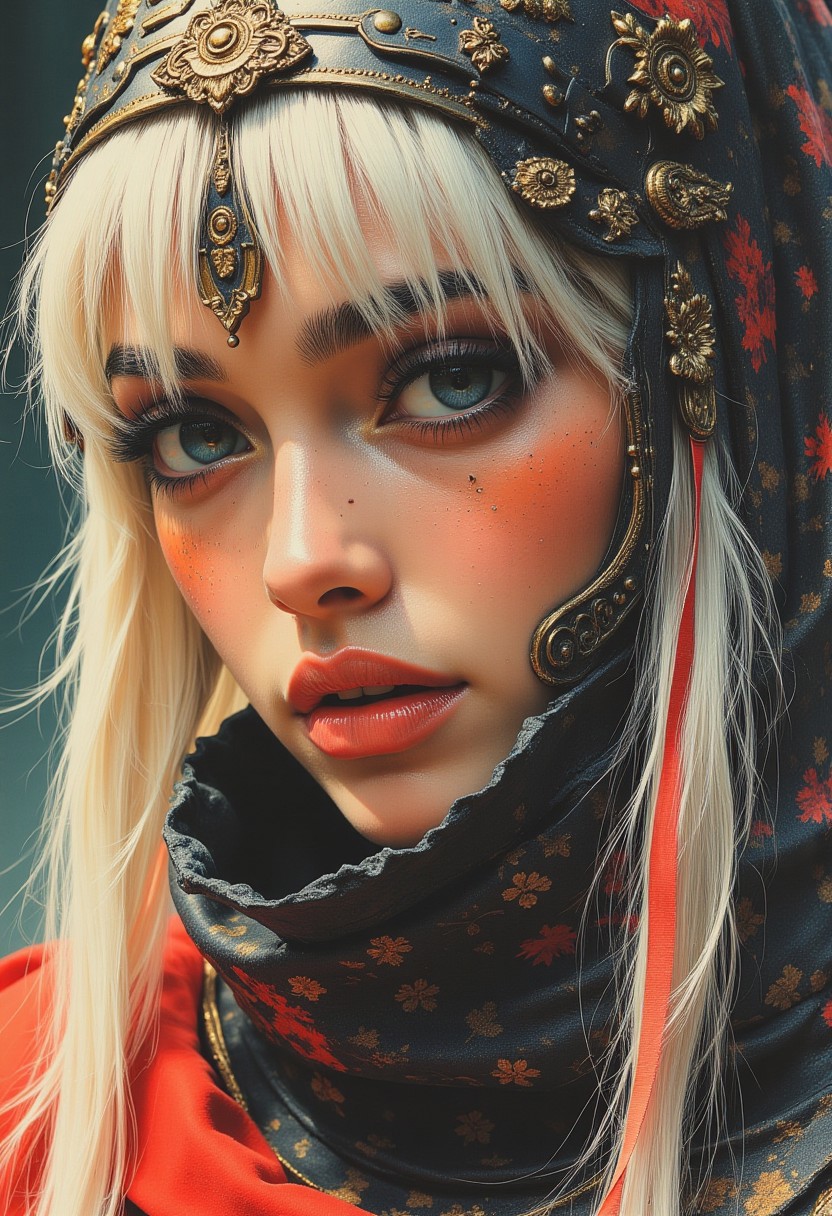 abstract photorealistic ink image in vivid, surreal colour gradient, closeup side portrait of korean woman wearing fantasy leather and bronze plate armour, long bleached hair, bangs