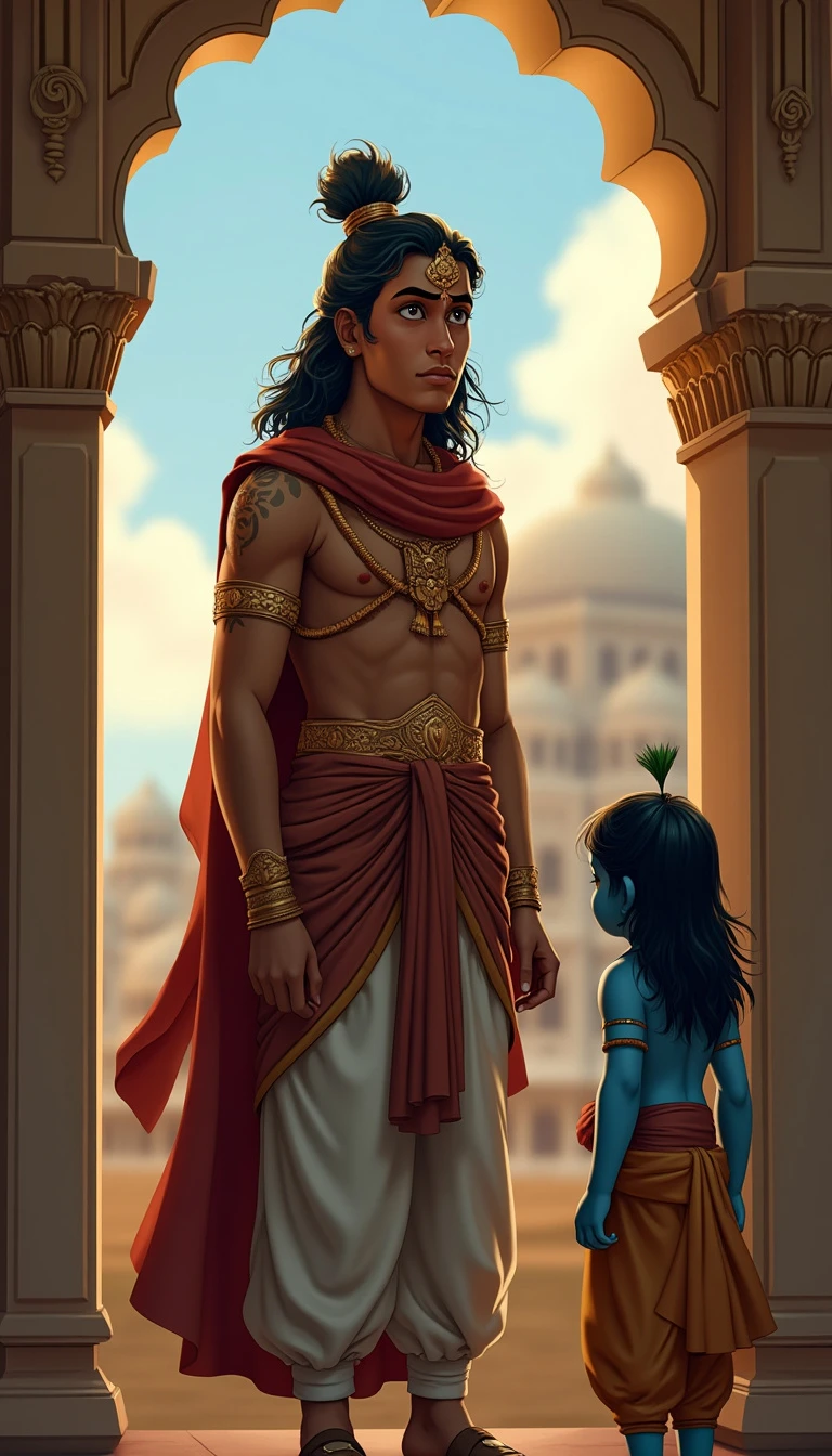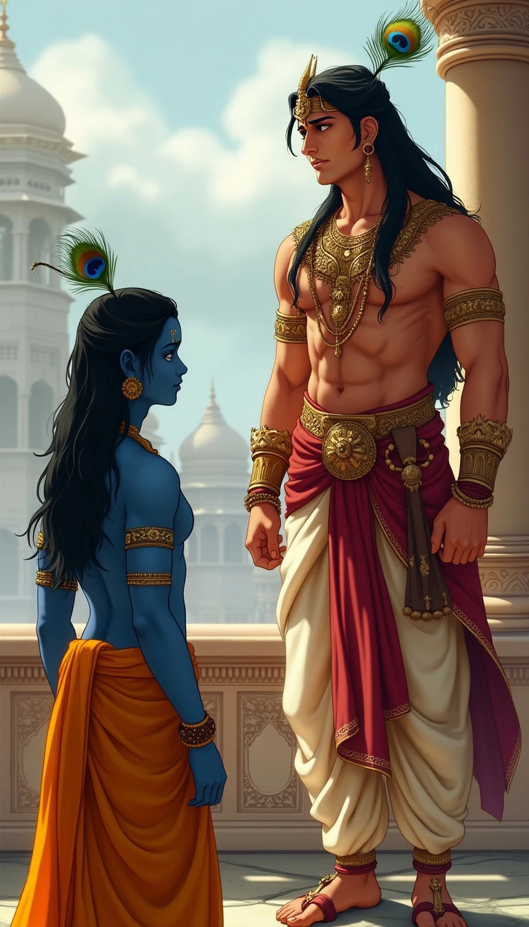 ### Prompt for Character Design and Background 1. **Character**: Arjuna from Hindu Mythology (Mahabharata) 2. **Expression**: Arjuna's face shows deep worry as he contemplates something significant. 3. **Background**: The scene is set in a Rajmahal, with Arjuna standing on the balcony. He gazes up at the sky, lost in thought. 4. **Attire**: Arjuna wears traditional attire reflecting Hindu mythology, complete with a dhoti and ornate armor. 5. **Visual Style**: The background is slightly blurred to create a cinematic and realistic effect, focusing on the characters. 6. **Additional Character**: Lord Krishna stands in front of Arjuna, facing him. 7. **Krishna's Appearance**: Krishna has blue skin, exuding a unique beauty. He wears a peacock feather on one side of his head and is dressed in traditional attire, in line with Hindu mythology. This prompt sets the stage for a visually striking and emotionally charged scene between Arjuna and Krishna.