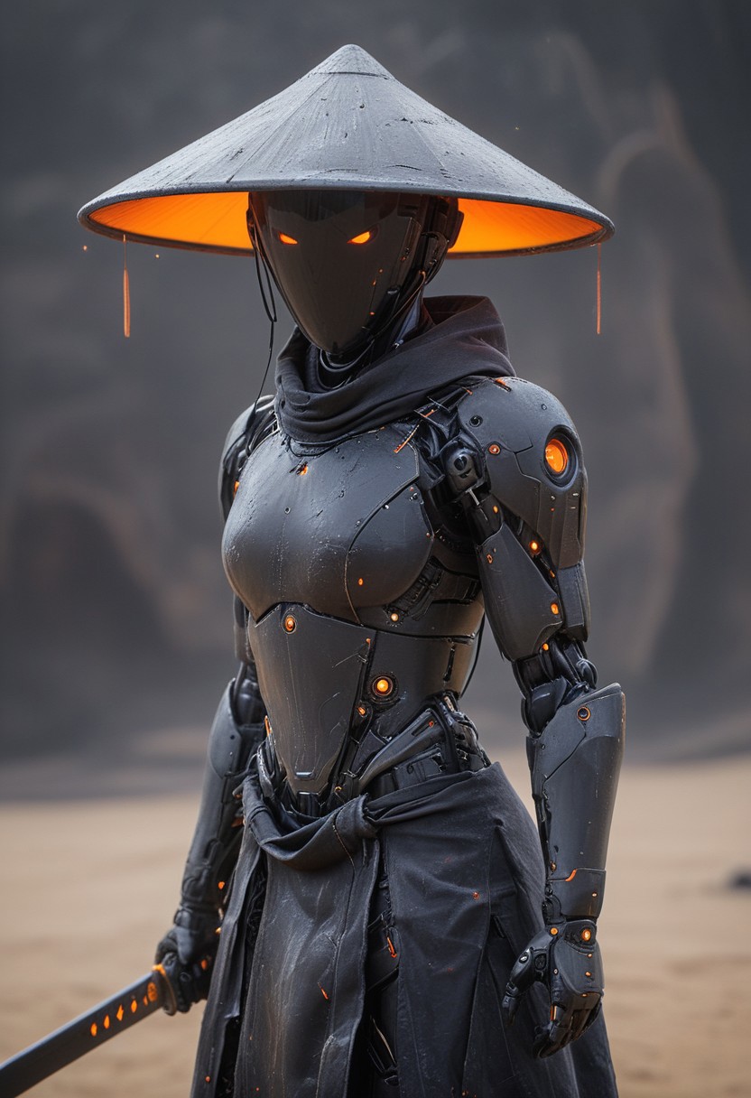 Craft a captivating vibrant dark black-neon caption for a photo capturing the essence of a cyborg Bedouin sorcerer in fight stance, defying expectations by conjuring a whimsical robot 'freak' from an oversized sedge hat. ethereal, smoky backdrop. throwing a translucent orange/tanslucent purple/black iaidow, weapon, katana, holding sword, ready to draw, sheathed, unsheathing, scabbard,, very detailed, atmospheric haze, Film grain, cinematic film still, shallow depth of field, highly detailed, high budget, cinemascope, moody, epic, OverallDetail, gorgeous, 2000s vintage RAW photo, photorealistic, candid camera, color graded cinematic, eye catchlights, atmospheric lighting, skin pores, imperfections, natural, shallow dof