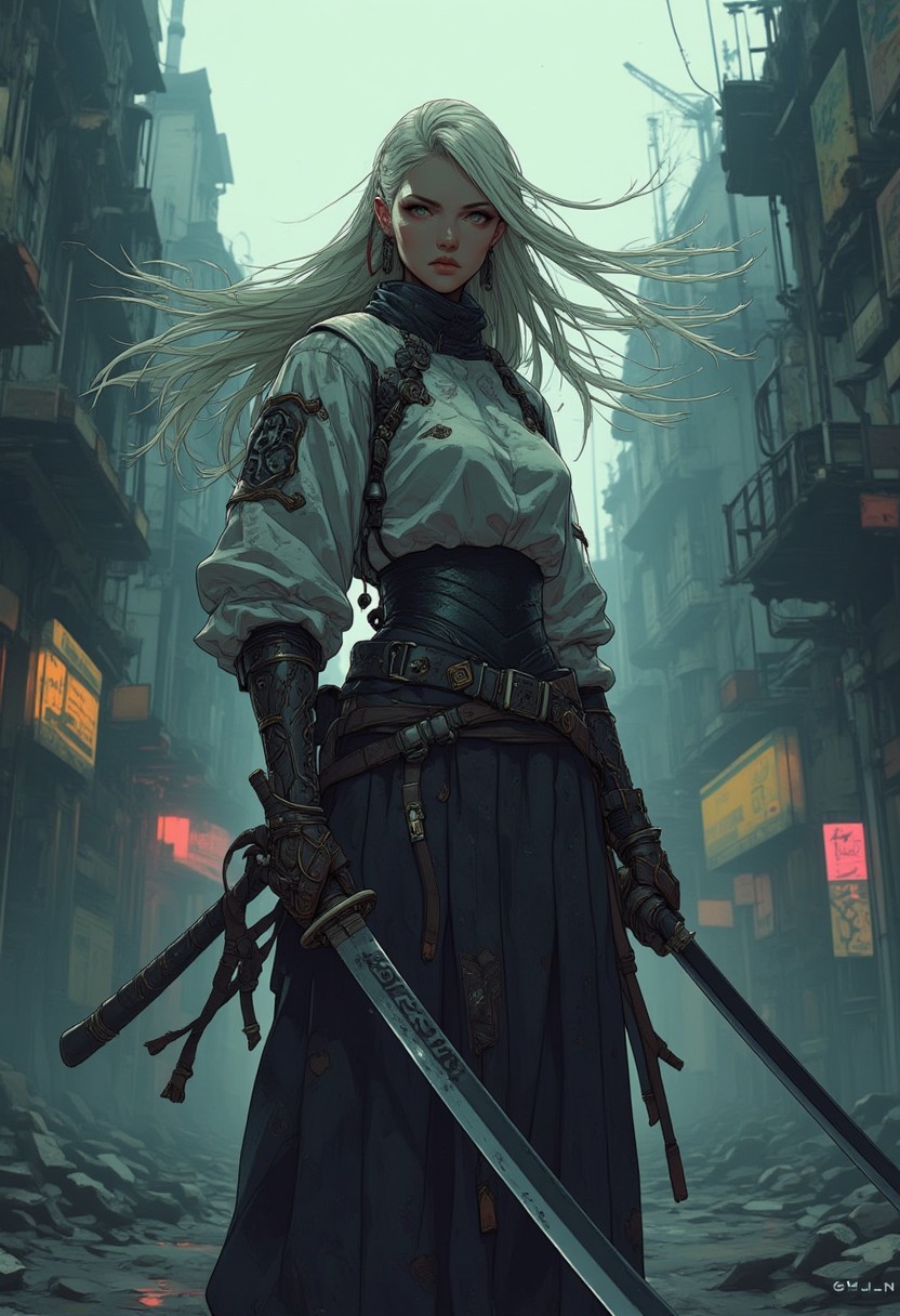pixel art, Post apocalypse, In the thick fog of a dilapidated city, in the middle of a dilapidated street, a samurai woman stands ready for a confrontation, clutching a long samurai knife with both hands. Her gaze is fixed on the camera lens, the wind blowing through her long hair flutters around her. the samurai woman is in a steady pose, firm, in a determined stance. the wind heightens the sense of anticipation. A charged atmosphere of emptiness, despair and tiredness, A dim, dystopian background with a warm, industrial tone - soft lighting,