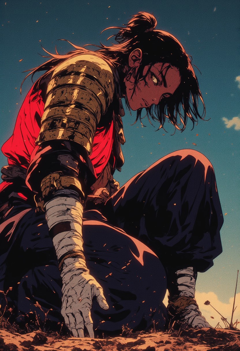 fantasy stylised illustration, anime style, cinematic, full body shot, close up, dynamic pose, perfect composition, covered in shadows shinobi in a dark clothes, feudal Japanese background, (kneeling in the dirt, mud, touching the ground with her hand), midnight, starry skies, baggy clothes moving on the wind, bright glowing gold pauldron striped through the whole body, huge glowing red waist, long fark gloves, white bandages on hands, eyes closed, looking down, expressionism, stature is agile and very graceful, woman, incredible, style of Edwin Austin Abbey, ne0nfant4sy,