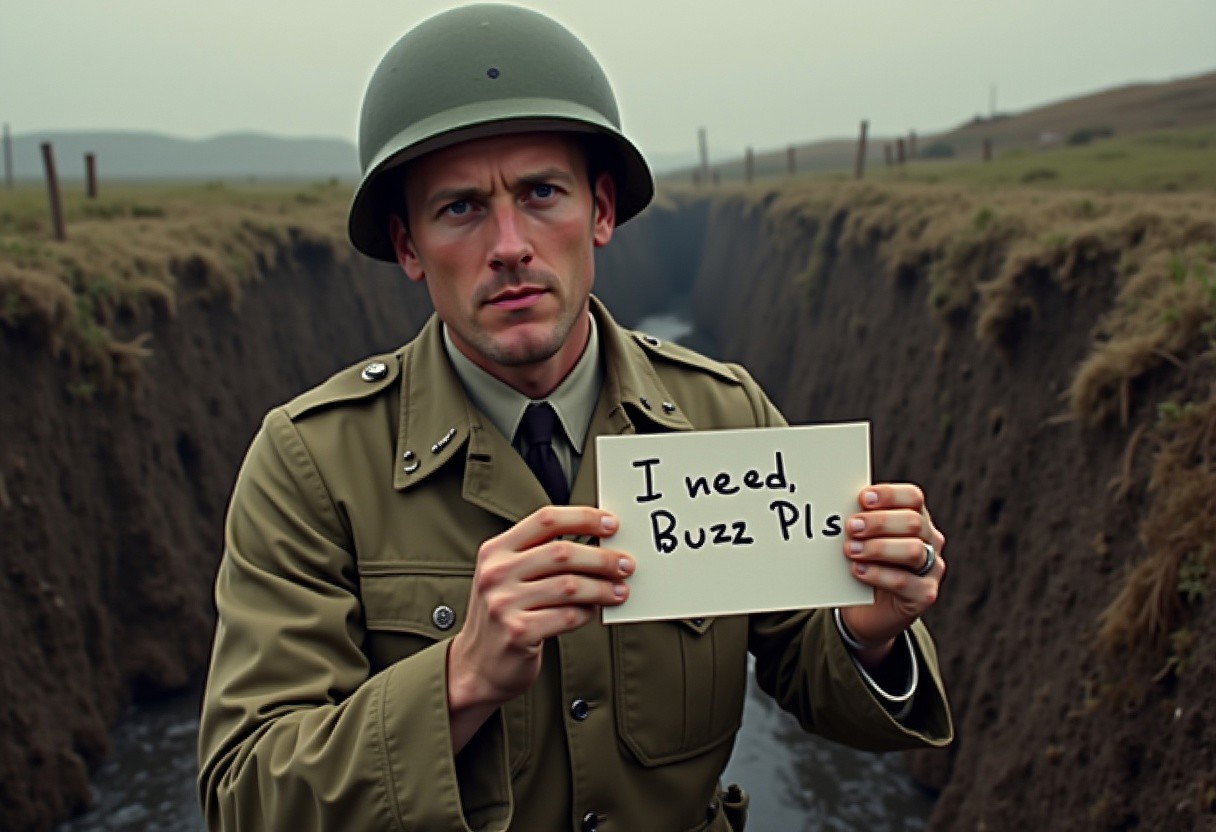 documentary with a WWII soldier in trench holding paper message reads; "I need Buzz Pls"