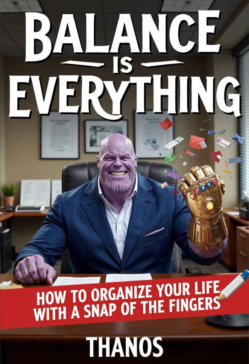 Design a satirical book cover for "Balance is Everything: How to Organize Your Life with a Snap of the Fingers" by Thanos. The cover should feature Thanos in a business suit, sitting behind a desk with his infamous Infinity Gauntlet, snapping his fingers with a smirk. Papers, to-do lists, and various cluttered items are disappearing into thin air, symbolizing his method of "simplifying life." The background should resemble a typical corporate office, with motivational posters and a neat, organized atmosphere. The title should be bold and playful, with "Balance is Everything" standing out prominently. Below the title, include the tagline "How to Organize Your Life with a Snap of the Fingers" in a smaller font. The author's name, "Thanos," should appear at the bottom, with the Infinity Gauntlet as part of the logo. The overall design should be clean and comedic, highlighting the absurdity of Thanos as a self-help coach.