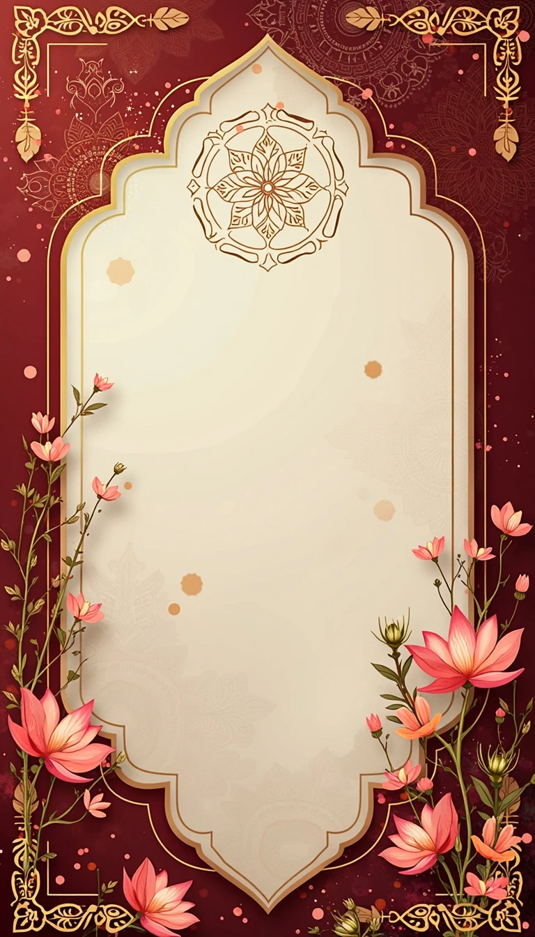 "Create a decorative background inspired by traditional Indian motifs. The color palette should include deep red and gold tones, symbolizing prosperity and auspiciousness. The border should feature intricate designs, including paisley patterns, lotus flowers, and peacock feathers in gold. In each corner, place subtle mandala designs to add a spiritual touch. The center of the design should have a faint watermark of a mandala or a tree of life, symbolizing harmony and growth. The floral elements throughout should be delicate and styled in gold, while the background color is a light cream or off-white, providing an elegant balance. Overall, the design should feel traditional, elegant, and spiritual, representing Indian values and Sanatan Dharma."