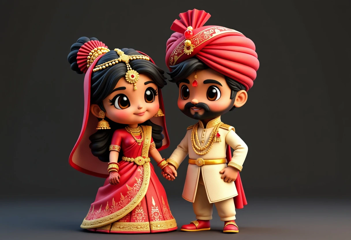 "A cute Indian bride and groom illustrated in a 3D style, standing side by side in traditional wedding attire. The bride wears a vibrant red and gold saree adorned with intricate patterns and embellishments, complemented by traditional jewelry like bangles, a nose ring, and a maang tikka. Her henna-covered hands are gently holding the groom's hand. The groom, strikingly handsome with features resembling Mahesh Babu, is dressed in an elegant cream-colored sherwani with golden detailing and a red turban with a traditional kalgi. The background features a solid black color to make the vibrant colors of their attire pop, creating a lively and cheerful atmosphere in the illustration."