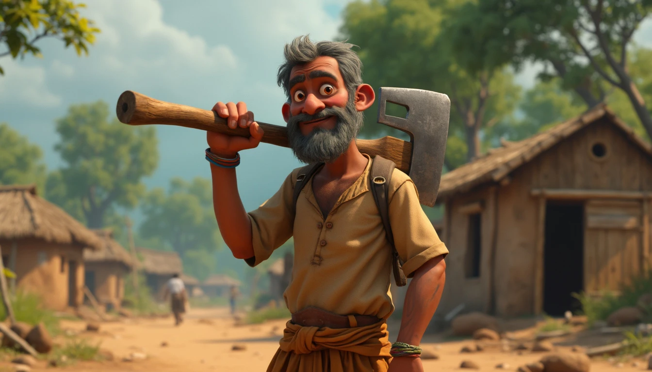 3d animation pixar style,An image of Mohan, a middle-aged woodcutter with a rugged face and a simple appearance. He is wearing a worn-out brown kurta and dhoti, carrying an iron axe over his shoulder. The scene shows a humble village in the background with small mud houses and a forest nearby.