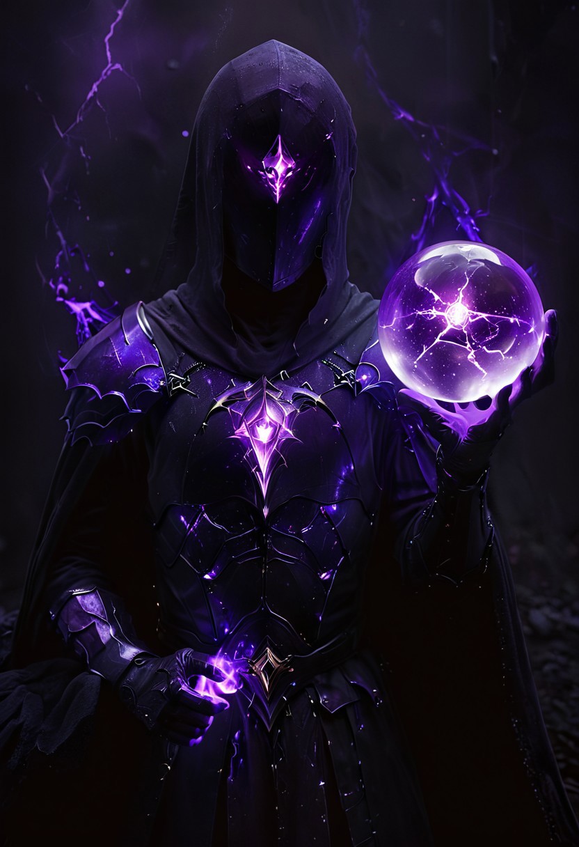 A dark sorcerer in gothic armor, his face is a glowing purple crystal, light swirling inside, he holds a staff with a similar glowing orb, wearing a black flowing cloak, intricate armor with glowing cracks on his chest, the setting is dim and atmospheric, soft light filtering through the background, creating an eerie magical vibe, the scene exudes dark fantasy and mysterious sorcery glowneon, glowing, sparks, lightning, dark, chiaroscuro, low-key
