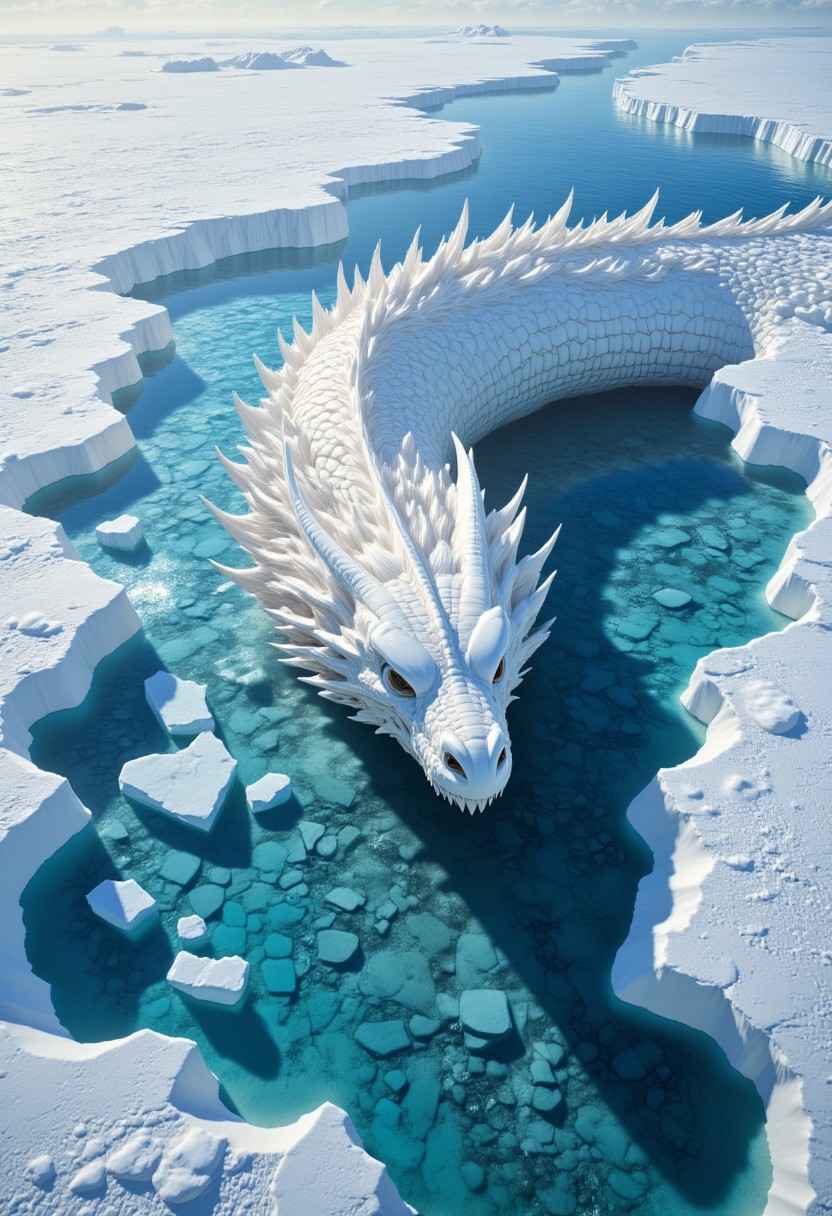 aidmaMJ6.1. A white colossal dragon is encased under a frozen lake. An aerial view shows off the dragons white scales shimmering underneath the ice. It is winter time