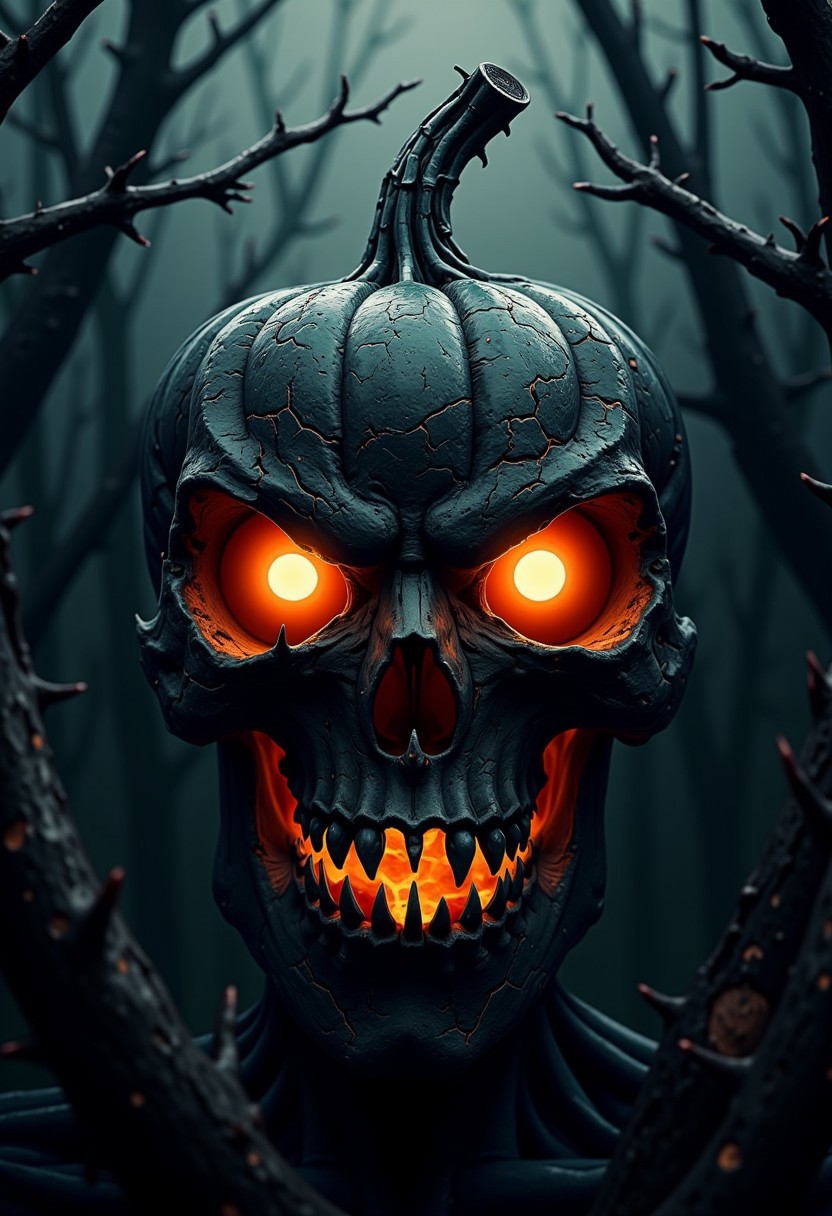 The image shows a haunting, Halloween-inspired scene featuring a menacing pumpkin that has been transformed into a skull. The pumpkin, rendered in dark, glossy black tones, bears an eerie resemblance to a human skull with jagged teeth and hollowed-out eye sockets, glowing with an intense orange light from within. The sharp, cracked details of the surface give it an ominous, weathered look, while the stem at the top, gnarled and twisted, adds to its sinister nature. The background is dark and misty, with shadowy, thorny branches reaching out, creating a spooky atmosphere. The art style is hyper-realistic with smooth, glossy textures and dramatic lighting that emphasizes the glowing eyes and mouth. The overall tone is macabre and unsettling, perfect for a dark, gothic Halloween theme.