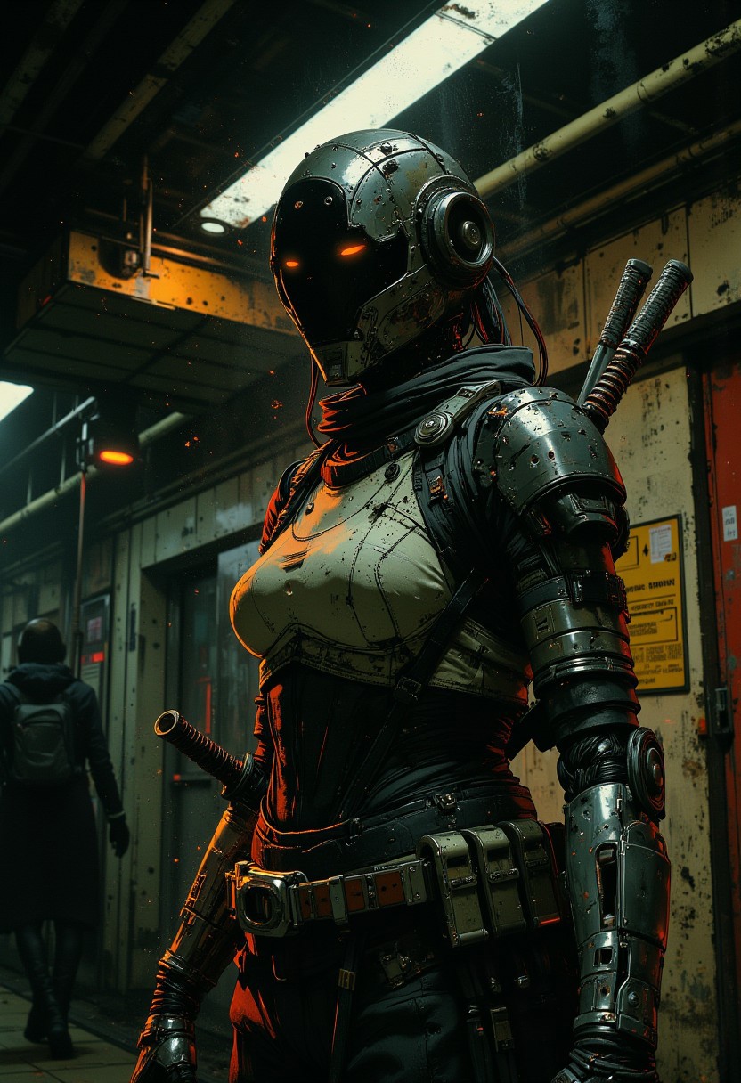a cyberpunk robot samurai woman, robot face with mirrored face shield, robot joints, body made of metals, cables and wires, silver armour, holding a katana by the hilt, in a cyberpunk subway station, dim lighting from overhead strip lighting, silhouetted in the gloom. Perfect Composition, realistic photographic image, RAW photo highest quality, perfect directional lighting, mythp0rt