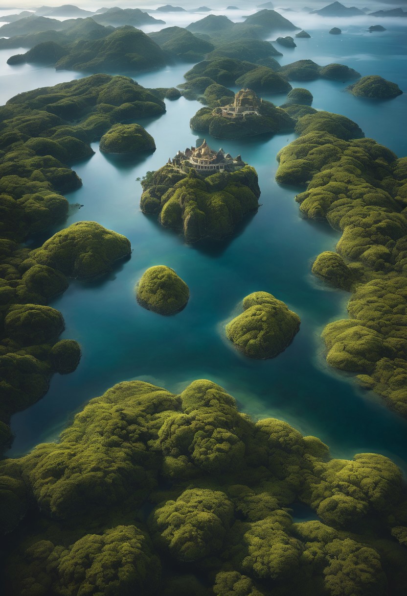A very detailed photo of a surreal and dreamlike realm where the world is delicately balanced between light and darkness, showcasing a stunning natural phenomenon. This ethereal landscape is dominated by floating islands, each casting half in shadow and half bathed in a brilliant, celestial light. The atmosphere is thick with a mystical fog that blurs the boundaries between the islands, enhancing the dreamlike quality of the scene. Reflective surfaces on the islands create distorted reflections, mirroring the sky and each other in a kaleidoscope of light and dark. The architecture on these islands appears ancient and partially crumbling, suggesting a civilization long lost to time but still resonant with mystical energy. Ethereal beams of light filter through the clouds, illuminating the islands in a dynamic interplay of brightness and obscurity. The overall mood is one of awe and wonder, as if witnessing a timeless battle between forces of light and darkness in a realm unbound by conventional physics.