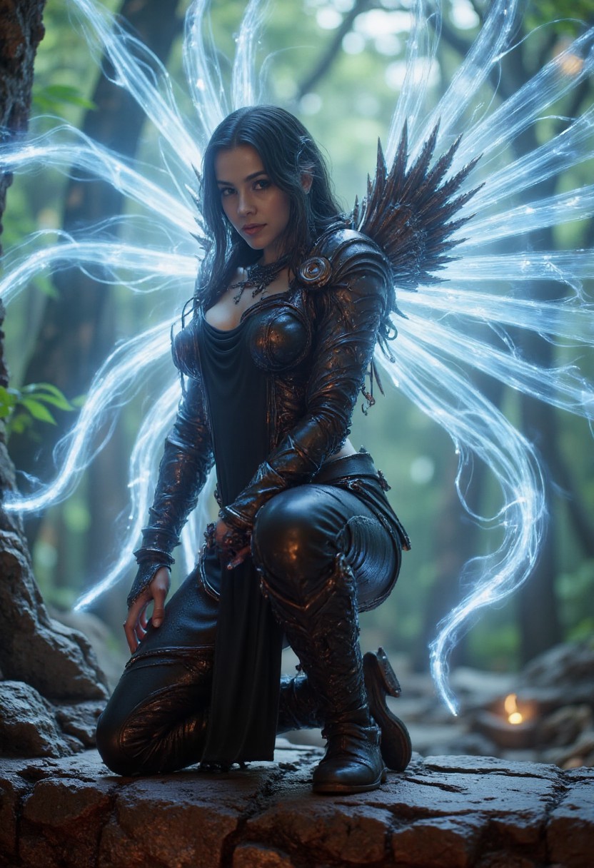 zavy-thrlngl, BusyShiny style DittersGurl dressed as a dark angel with ethereal wings. She is kneeling on a stone ledge at the end of existence.