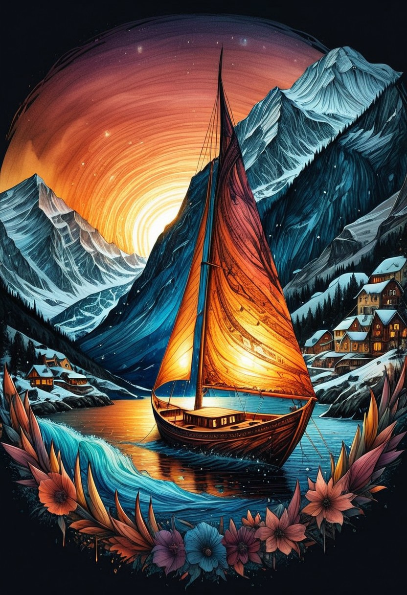 Pencil_morph_style Beautiful sailboat made of pencil on sparkling waters at a Skandinavien fjort, Mountain made of pencil, Sunset, Digital watercolor Illustration of a WinterScape sunset, by Waterhouse, Carne Griffiths, Minjae Lee, Ana Paula Hoppe, Stylized watercolor art, Intricate, Complex contrast, HDR, Sharp, soft Cinematic Volumetric lighting, flowery pastel colors, wide long shot, perfect masterpiecedetailed matte painting, deep color, fantastical, intricate detail, splash screen, complementary colors, fantasy concept art, 8k resolution trending on Artstation Unreal Engine 5, SoraSleepAI, Circle