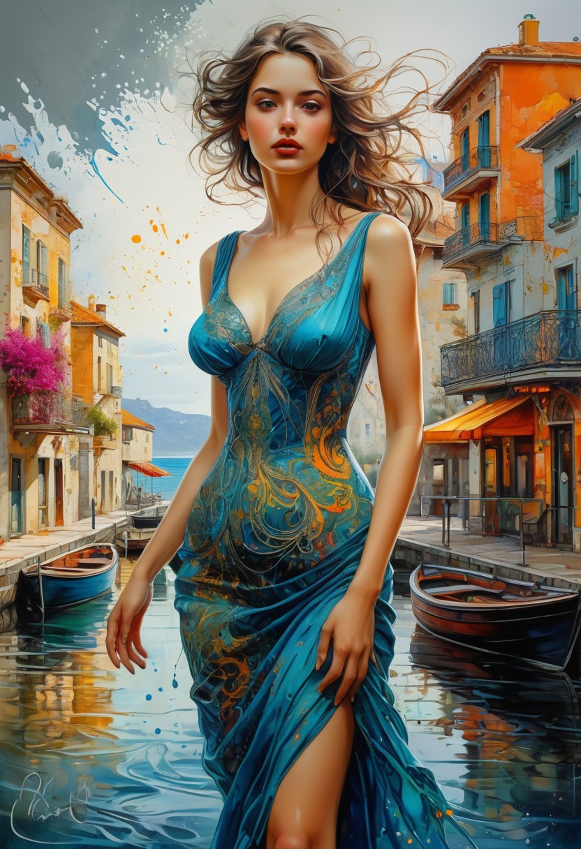 Portrait of a beautiful woman, Art Nouveau style, emphasising flowing lines, integrated with modern fashion sensibilities and digital motifs, neon colours, Alcohol Ink Splatter Art, Super Realism with Super Detail in 8K, Divine Proportions, Intricate and Cinematic with Stunning Atmospheric High Detail, Fantastic Realism and Sharp Focus, Mysterious Filigree Elements, Glowing Accents, Perfect Composition on Complex Background. Portrait of a girl, very beautiful girl, full body, a painting of a woman Charming pencil sketches by Albert Eckhout, in full color In this fascinating acrylic painting you can see a charming woman. The girl is in a small town by the sea. The dress is very elegant and very well made. This stunning image captures the viewer's attention with its vibrant tones and dreamlike atmosphere. The expertly crafted brush strokes and intricate details show the artist's skill, making the image truly captivating. Through vivid colors and meticulous execution, the painting showcases the artist's ability to create a stunning and visually striking depiction.