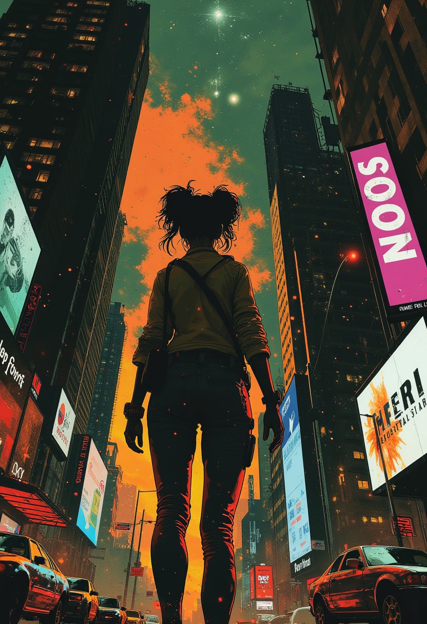 asian woman in hipster street gear, standing on Times Square with tall towers and futuristic skyscrapers, neon advertising boards for products, surreal colours, detailed night sky with stars and nebulas