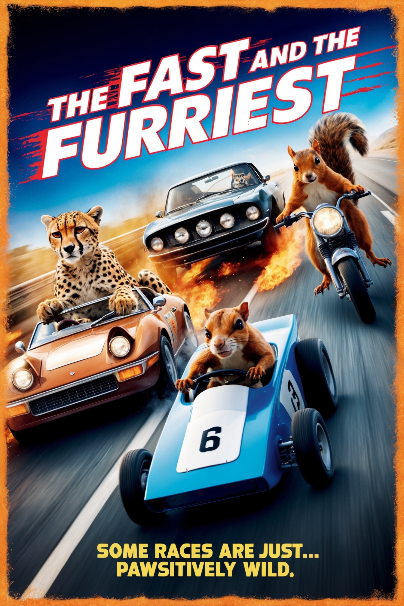 this poster features an action-packed race between a variety of animals. A cheetah, a greyhound, and a squirrel in tiny, souped-up cars are speeding down a highway, leaving trails of fire and dust behind them. The cheetah leans out of its car with aviator sunglasses, while the squirrel rides on a mini-motorcycle, looking intense. In bold, neon letters across the top, the title "The Fast and the Furriest" is splashed across the poster, with the word "Furriest" in bold, furry-textured font. Below, the tagline reads, "Some races are just...pawsitively wild."