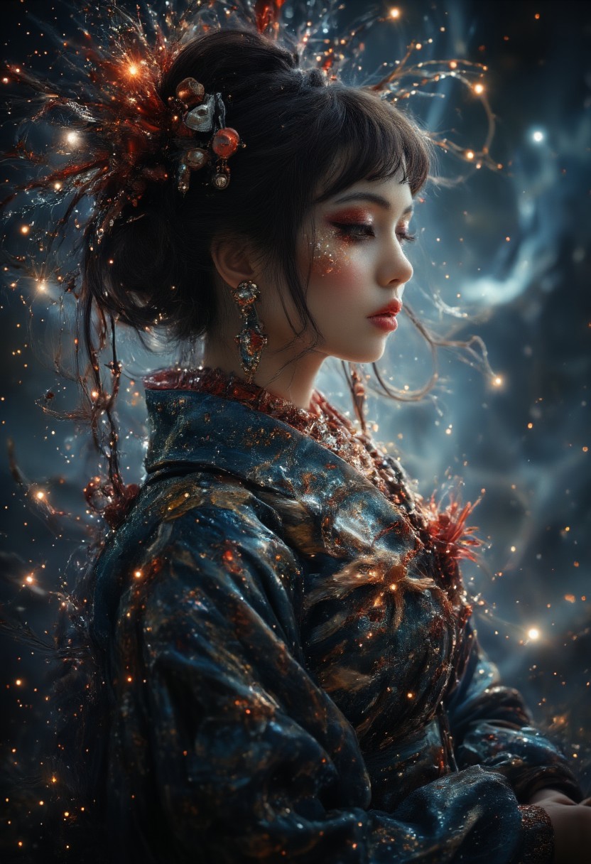 aidmaGlow, Midjourney_Whisper, noc-space, image stunningJapanese princess, long loose hair, dark eyeshadow, bangs, hair ornaments, necklaces, earrings, sumptuous flowing dress, BREAK. background of swirling stardust and nebula gas