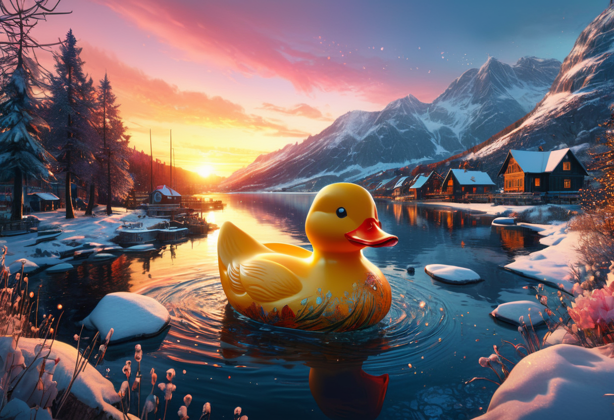 Beautiful huge Rubber-duck on sparkling waters at a Skandinavien fjort, Sunset, Digital watercolor Illustration of a WinterScape sunset, by Waterhouse, Carne Griffiths, Minjae Lee, Ana Paula Hoppe, Stylized watercolor art, Intricate, Complex contrast, HDR, Sharp, soft Cinematic Volumetric lighting, flowery pastel colors, wide long shot, perfect masterpiecedetailed matte painting, deep color, fantastical, intricate detail, splash screen, complementary colors, fantasy concept art, 8k resolution trending on Artstation Unreal Engine 5, SoraSleepAI, Circle