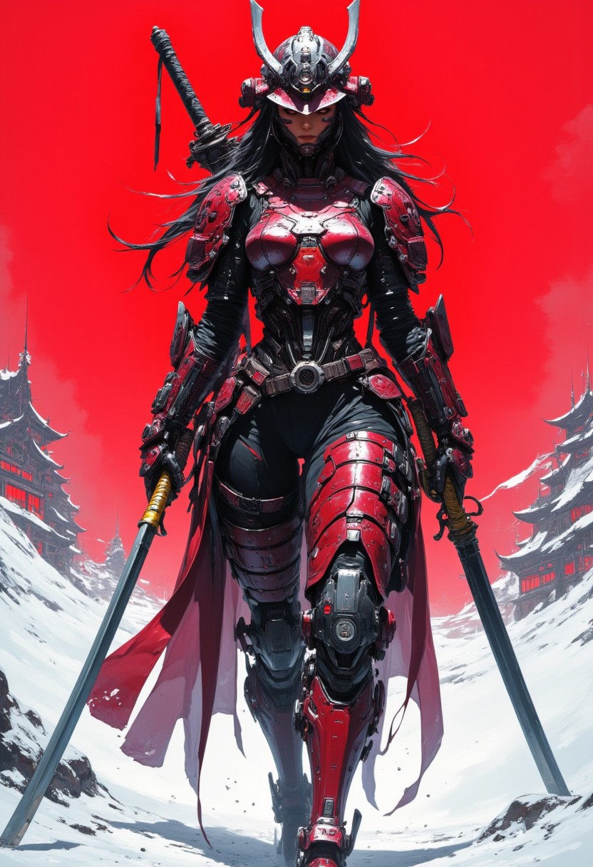 cyberpunk anime style, a stunning japanese female warrior, long flowing hair, wearing samurai armour and helmet, holding a katana with both hands on a snowy battlefield, theme in neon, red and black colour, high quality, highly detailed