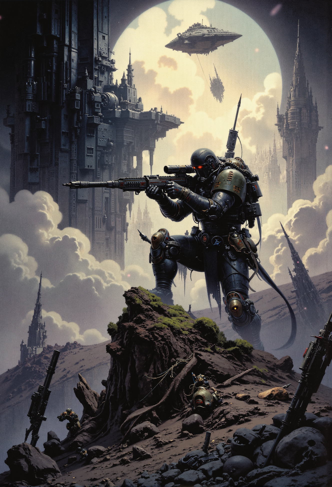 analog film photo . Frank Frazetta fantasy oil painting (art by Zdzislaw Beksinski:2), a hero squad, defense line, bridgehead, securing the area. giant weapons, taking aim, ready to shot. on a hill, space dropship. grimdark, mythp0rt, FredFraiStyle <lora:- Flux1 - vanta_black_V1.0.safetensors:0.5>, <lora:FluxMythP0rtr4itStyle.safetensors:0.76>, <lora:FredFraiStyle-FLUX-Share.safetensors:0.75>, <lora:Warhammer_Rogue_Trader_Style_flux-000021.safetensors:0.5>, <lora:ARTifacts.safetensors:0.5>, <lora:Movie_Portrait.safetensors:0.5>, <lora:m100-style_v.02.safetensors:0.25>, <lora:frazetta_flux_v2-000150.safetensors:0.5>, . faded film, desaturated, 35mm photo, grainy, vignette, vintage, Kodachrome, Lomography, stained, highly detailed, found footage