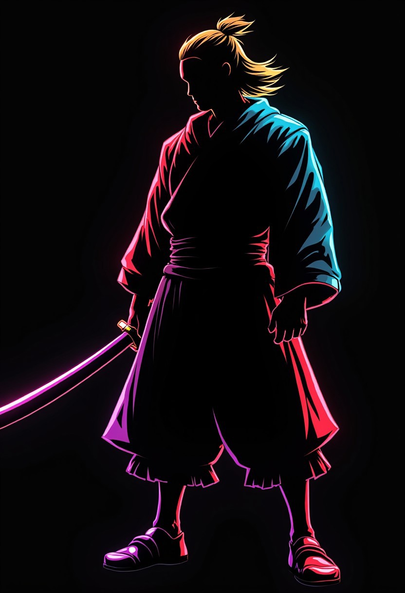 anime-style silhouetted outline against a dark background, a ronin samurai warrior, rainbow-coloured, holding samurai sword