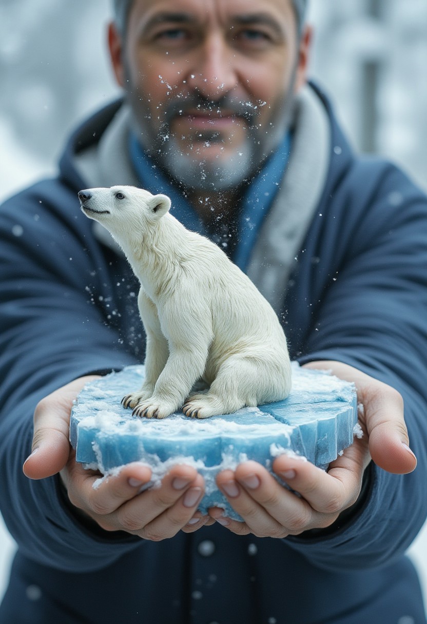 Miniature diorama of a polar bear sitting on an ice floe in the snow, held in the hand of a man, with snow falling above the diorama