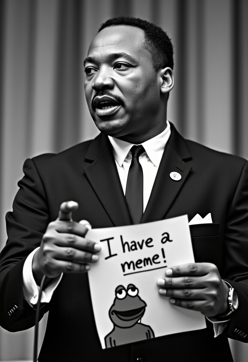 black and white photo of martin luther king holding a speech. You can see his notes. On the paper is the text "I have a meme!" and an image of pepe the frog. monochrome.