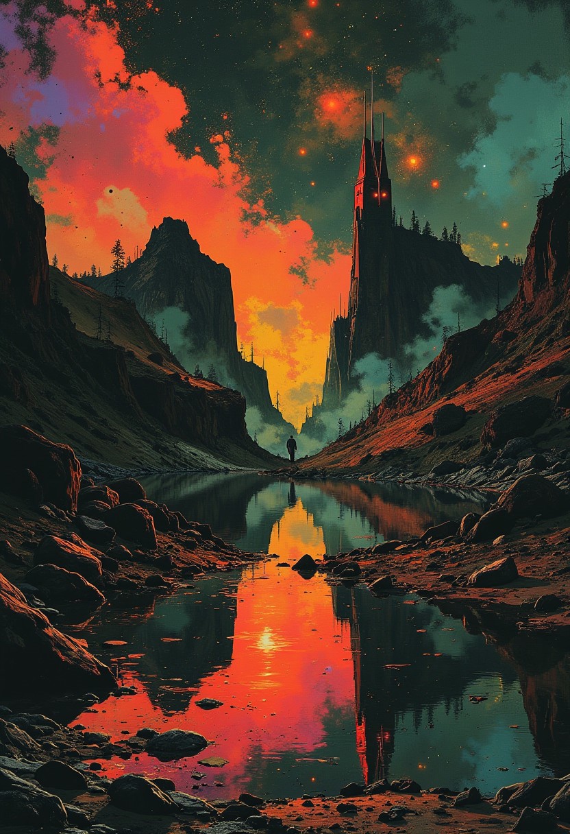 abstract oil painting, gradient vibrant neon colour, rough, textural, broad brush strokes, a futuristic sci-fi city with tall, perfectly reflected in a tranquil, still lake, at night, surreal colours, detailed night sky with stars and nebulas