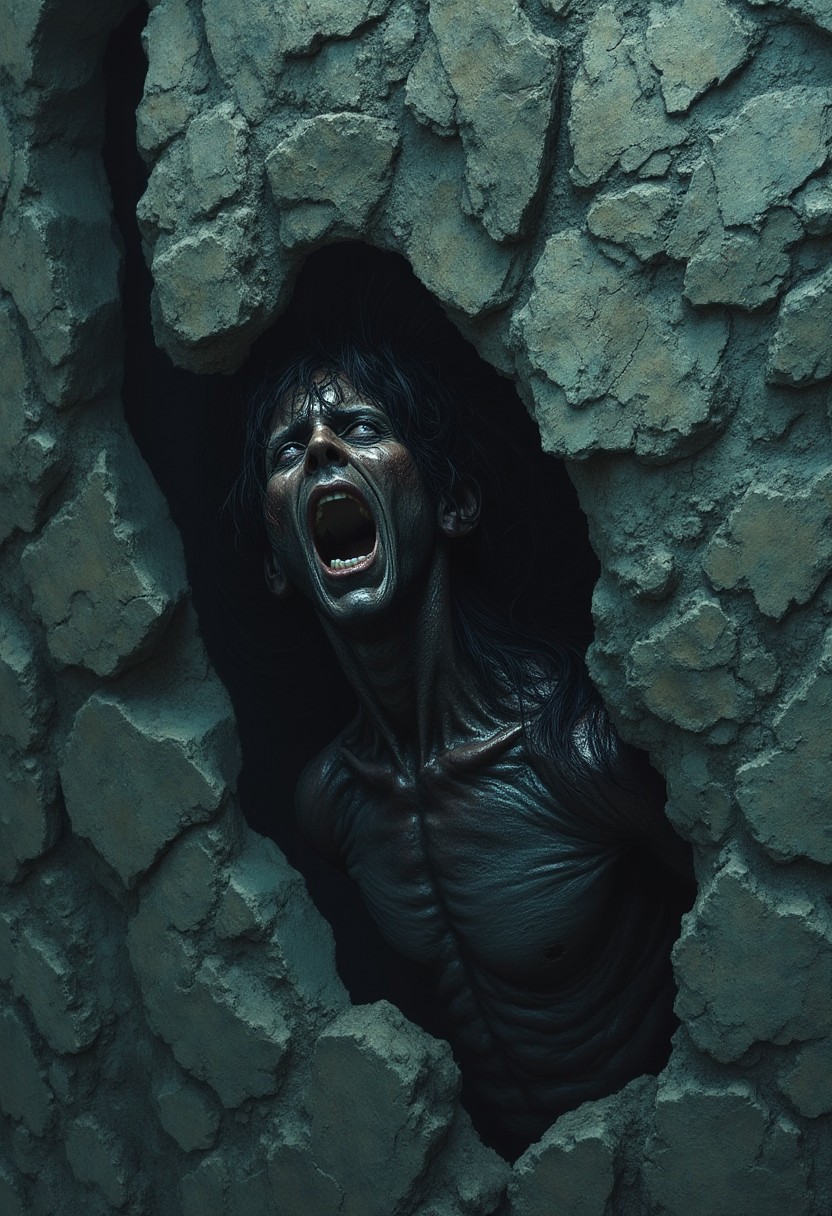 score_9_up, score_8_up, score_7_up, sideview, highly detailed, we see a rockface, a humanoid creature is merging from the rock, screaming, only the upper body visible yet, dark mood, wet stone, full body