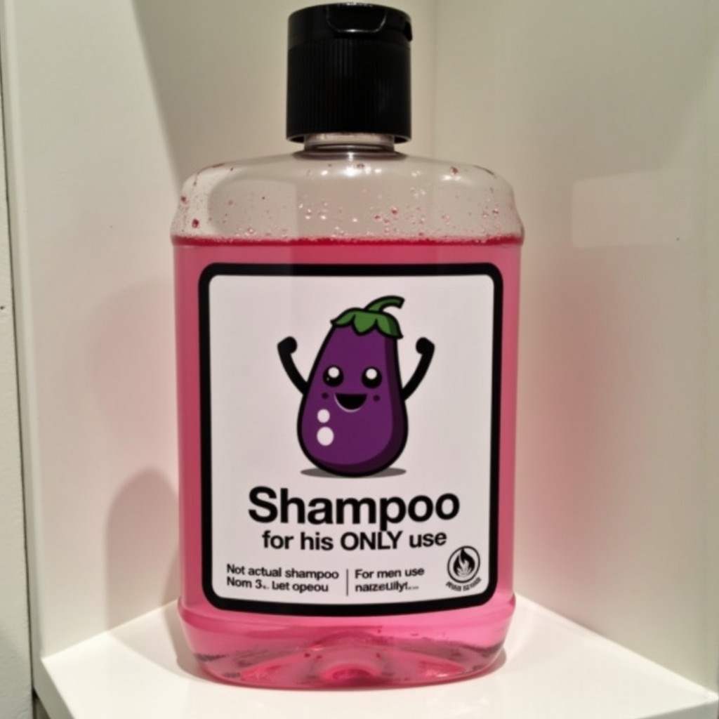 This is a picture of a shampoo bottle. It is a clear plastic bottle with a rectangular shape and a white label with black border. The label depicts a cartoon eggplant with strong hands and a smiley face. The front of the label features prominent black bold text "Shampoo". Below this, in smaller text, it reads "for his ONLY use" in black. The features are specified as "Not actual shampoo" and the text "For men use only" is printed at the bottom right corner. The bottle contains a translucent pink liquid. The bottle is sitting on bathroom shelf.