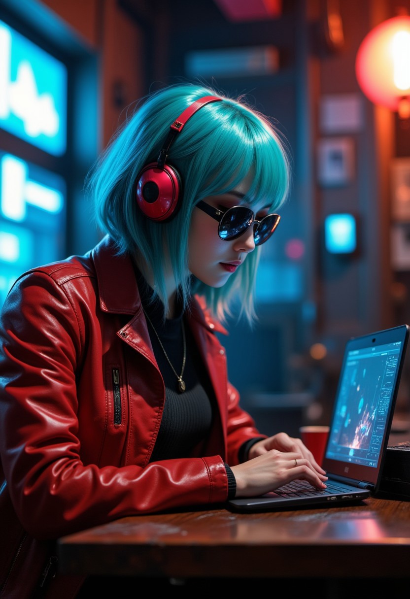 japanese female sci-fi with cyber implants, neon light blue bob cut hair, cyberpunk street clothing, red leather jacket, aviator sunglasses, hunched over a laptop in a dark cyberpunk cybercafe, directional lighting