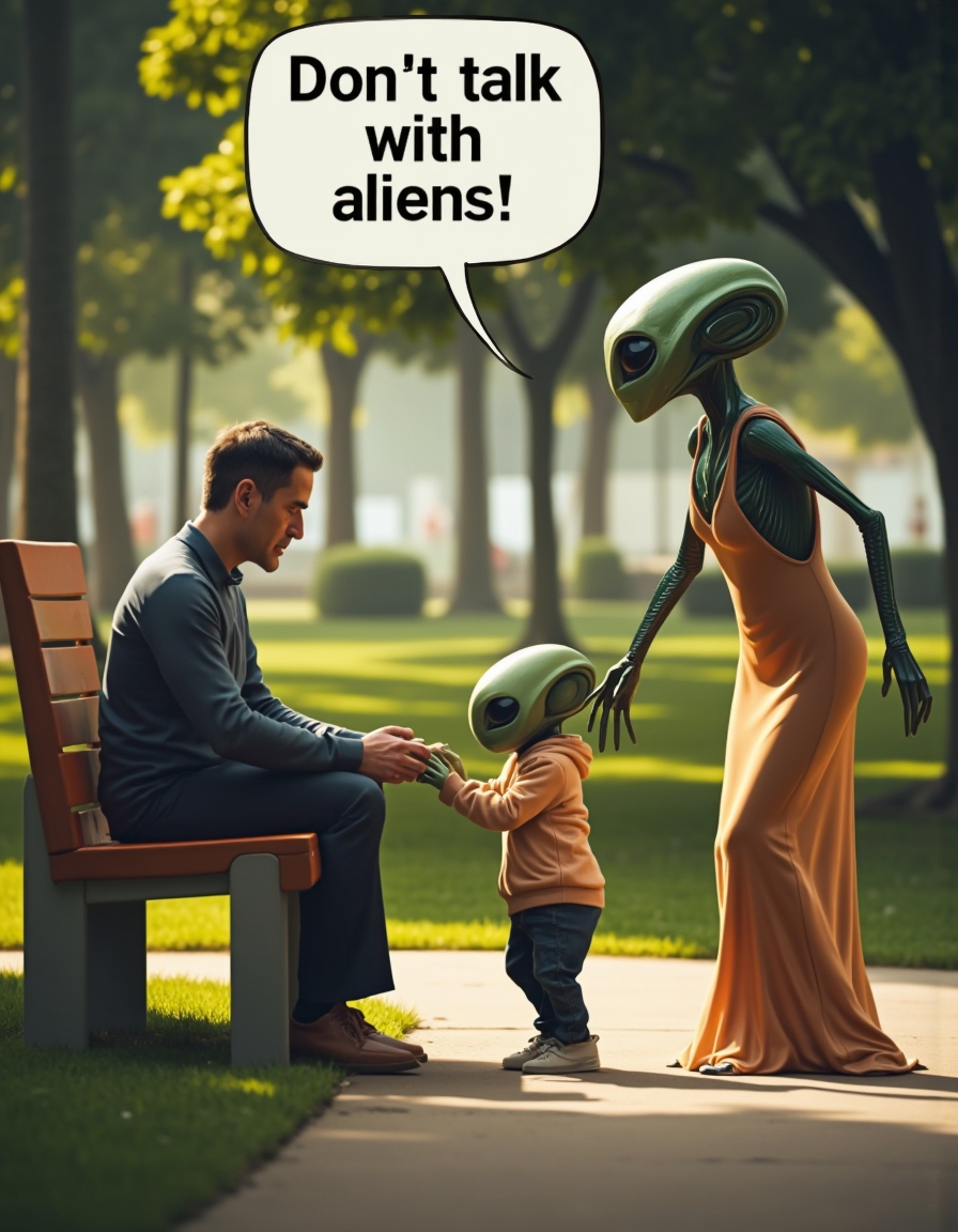 hyperrealistic image , to the left is a sad man sitting on a park bench , to the right is an alien woman dragging her son alien boy away from man , woman saying in speech bubble "Don't talk with aliens!", <lora:flux\flux_realism_lora.safetensors:0.71:0.71> <lora:flux\detailer_flux_v1.safetensors:0.5:0.5> <lora:flux\aidmaImageUpgrader-FLUX-V0.1.safetensors:0.5:0.5>