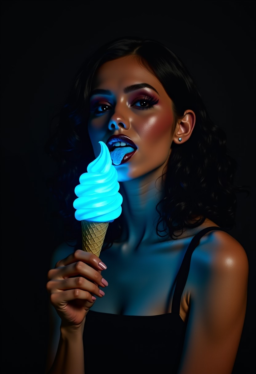 A 100% black background image of a sexy woman with dark hair and dark makeup. She is wearing a black dress. She is licking a glowing blue ice cream. The ice cream has a glowing blue spiral pattern. The woman's tongue is glowing blue. The background is completely black.