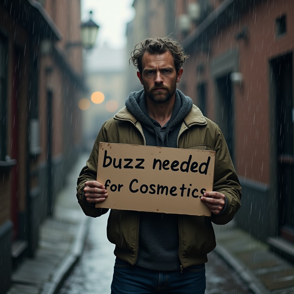 "buzz needed for cosmetics" on a sign held by a sad man in an alley with saggy clothes it is raining and looking at the viewer