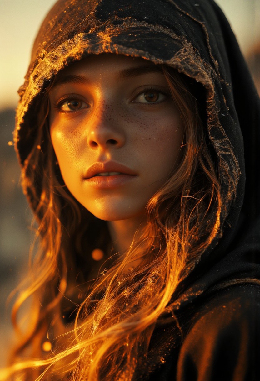 cinematic Closeup movie still-shot, Create an action scene featuring a halfling wizard Female and Long hair in a broad outworn hooded cape shading her eyes, standing in the midst of an DARK desert forest. She is executing a powerful spell with her Long orb-staff with a translucent Amber Sphere head that carves a furrow through the sand and enemies on the ground, scattering them away or disintegrating them with the force of the blow. The focus is on the intricate designed luminous orb-staff capturing the dynamic speed of the Magic force. Pressure Wave, floating particles, the Closeup of her face silhouette visible against the backdrop of the setting sun, which shines through parts of her metallic body. Her billowing Linen cape adding to the dramatic effect. The scene is vibrant with atmospheric lighting and cinematic composition. Super Face Closeup