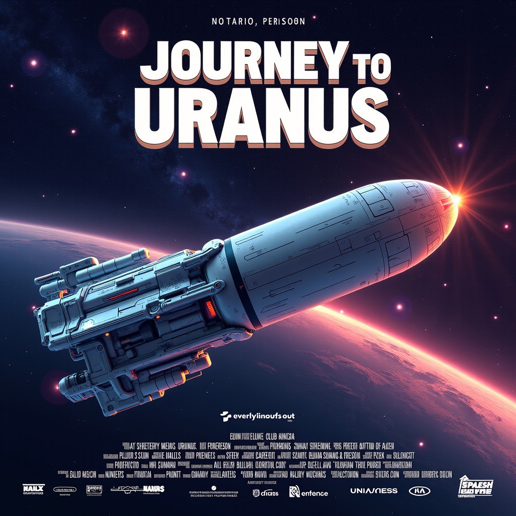 picture of a movie poster, Title: Journey to Uranus, in Background: A vast deep space, dotted with sparkling stars that create a mysterious and adventurous atmosphere. Foreground: A long and thick cigar-shaped spaceship. The ship features futuristic details and vibrant colors. Background: The planet Uranus that playfully resembles a buttocks without being vulgar, with a clearly visible black crater that almost seems like a distinctive feature, enhancing the film's light-hearted tone. Bottom: A list of the film’s production companies, stylized and clearly visible.
