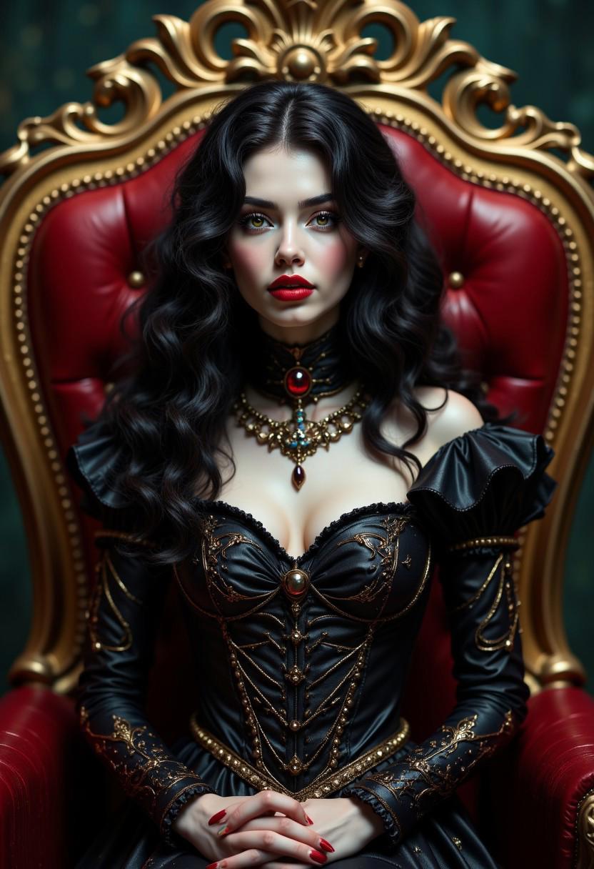 (Masterpiece, Best quality, hyper detailed:1.3), 1girl, a dark skinned vampire queen with golden fangs and green eyes, curly hair, inside, her throne room, Large room clutter, gold engravings, diamond and platinum filigree, black roses, angelic motifs, biomechanical, by Giger, Tim Burton, Artgerm, hyperdetailed, cinematic,aidmaHyperrealism, dark fantasy, eerie, horror
