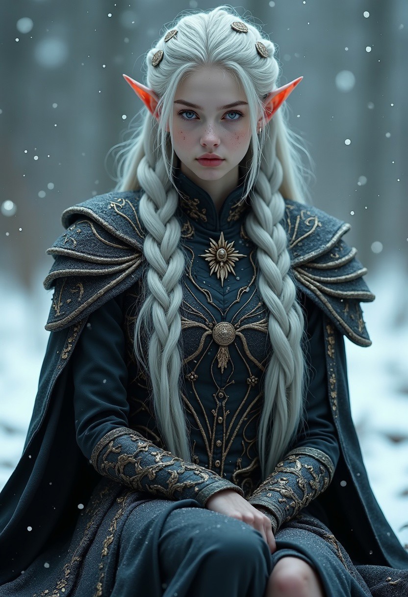 Full body potrait, hyperrealistic detail, Rendered in a fusion of photorealism and digital surrealism, Beautiful surreal high fantasy portrait, A Female warrior with dark, ashen skin and long, long silver-white hair, intricate braids, black Armor and clothes, facing the viewer stands amidst snowflakes, ethereal and otherworldly presence, with sharp, elf-like ears and adorned in elaborate, dark armor with detailed engravings and metallic patterns. Her expression is somber and introspective as she sits quietly, her eyes are silver, in a cold and desolate landscape under a dim, moonlit sky. Her armor is very detailed with decorations, giving her an air of nobility, Real sharp photo, snowing, snowflakes in the air, blurred background, rose gold minerals, shiny aura, highly detailed, Kirnan Shipka, Januz Miralles, Hikari Shimoda, glowing stardust by W. Zelme. The overall effect is breathtaking and truly captivating, shimmering skin that glows like the night sky, long, hair adorned with tiny, glowing stars, deep, cosmic eyes, ethereal hues, mysterious and enchanting expression, dreamlike and mystical atmosphere, RAW candid cinema, 16mm, color graded portra 400 film, remarkable color, ultra realistic, textured skin, remarkable detailed pupils, realistic dull skin noise, visible skin detail, skin fuzz, dry skin, shot with cinematic camera, detailed skin texture, (blush:0.2), (goosebumps:0.3), subsurface scattering, fluxenh4nce