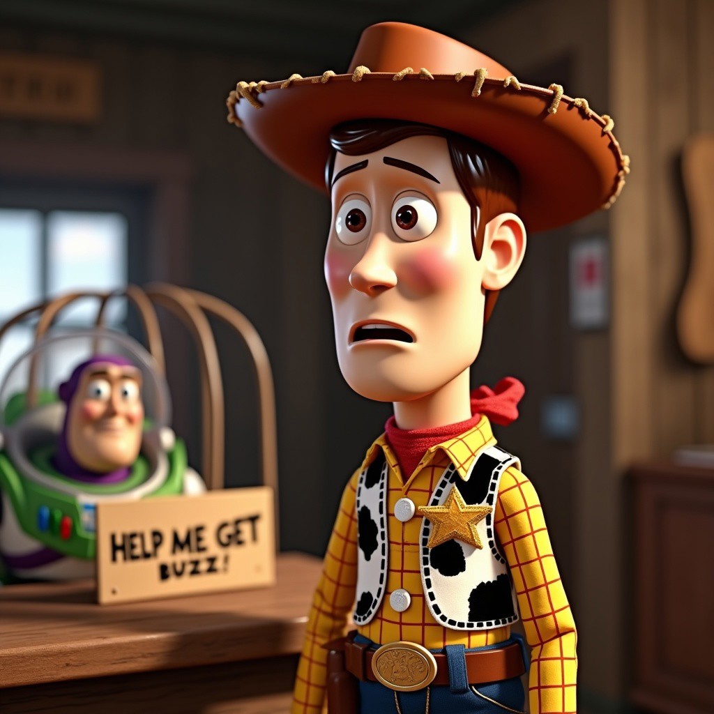 Woody from toystory is a very worried cowboy in a saloon with a sign that reads "Help Me Get Buzz!", with buzz lightyear figure in a cage in the background detailed eyes, highly detailed, photography, ultra sharp, film, bokeh, professional, 4k