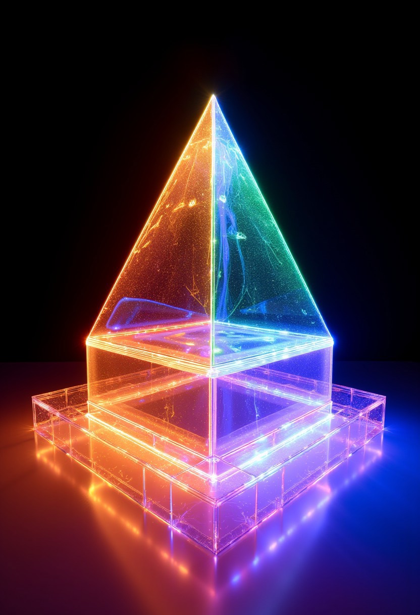 ArsWorldOfLight, a glowing prism made of light, with a gradient of coloured light in the colours of th rainbow, red, orange, yellow, green, blue, indigo and violet
