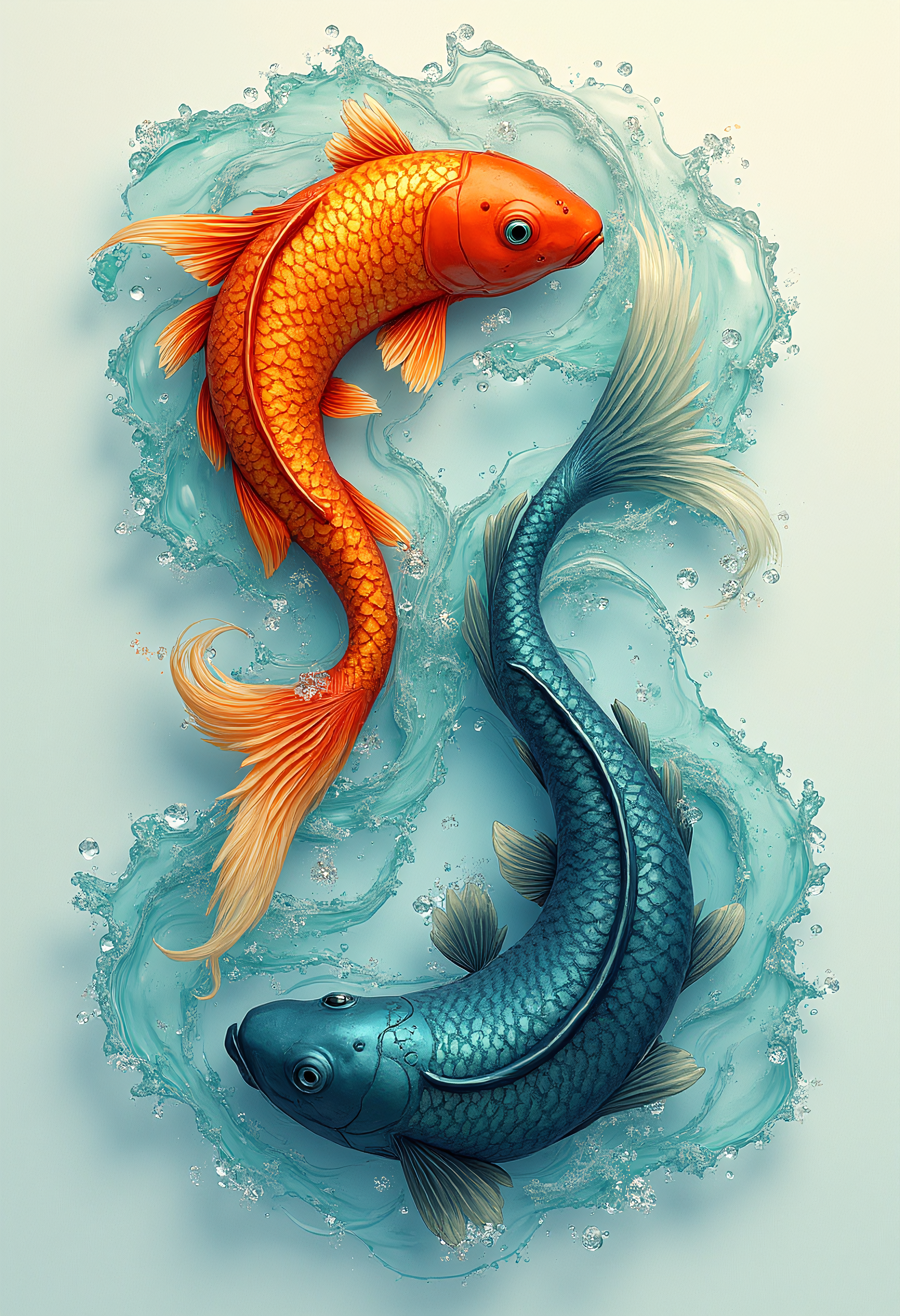 A pair of fish swimming in a continuous loop, forming the shape of an infinity symbol. One fish is painted in vibrant warm tones, while the other in cool blues and greens, symbolizing the endless flow and balance of nature. The water around them has a swirling, dynamic texture, creating a sense of movement and unity.
