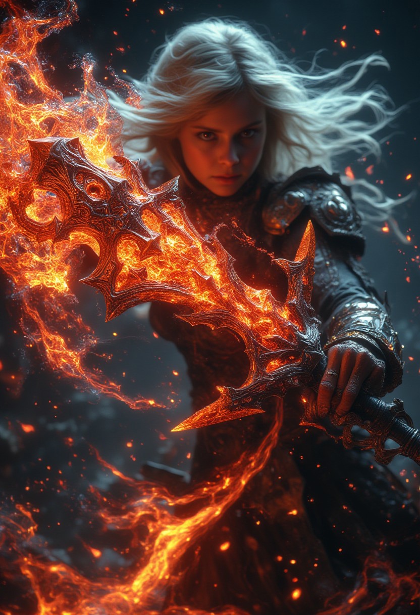 In a dramatic close-up shot, a blonde girl warrior's hands grasp a colossal battle axe, its foreboding blade aglow with fiery red runes and surrounded by whirling embers and flames. The spiked handle and hell-forged metal seem to radiate dark energy. As the girl warrior swings the axe with calculated ferocity, the camera captures the intense motion, highlighting the sword weight and force as it slices through the air.