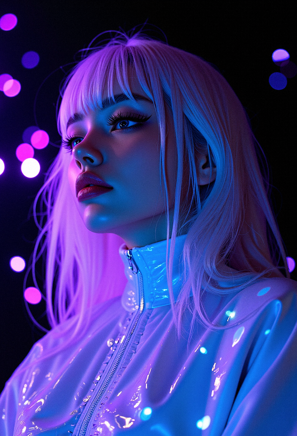 A face close-up of a cosmic beauty with asymmetrical hair, with luminescent hair and reflective clothing, in a dark, mystical background with shimmering light patterns accentuating her form.Soft, diffused lighting that highlights the glow in her hair.Cosmic particles illuminated by soft light swirls around her.Color-shifting light that transitions between purple, blue, and white around her.A glossy, high-tech fabric that reflects both the light and shadows around her.Semi-transparent glowing threads weaved throughout the outfit.Detailed cosmic embroidery that catches the light and glows softly. dynamic pose,