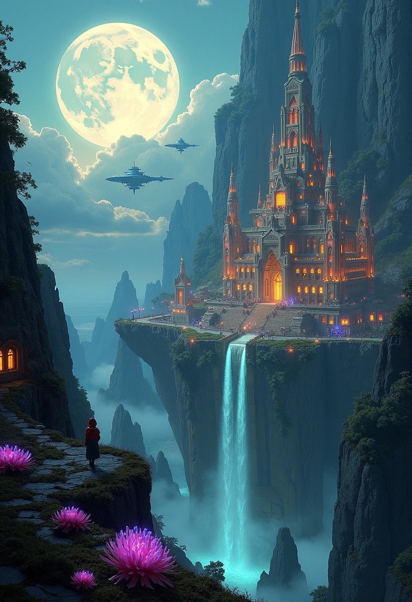 A majestic ancient city built into the side of a towering mountain, glowing softly under the light of a massive full moon. The city is a mix of futuristic technology and ancient architecture, with towering spires, intricate carvings, and glowing energy fields. Waterfalls cascade down the cliffs, creating mist around the city, while vibrant bioluminescent plants line the pathways. In the sky, strange flying ships hover near the city, their lights illuminating the clouds. The atmosphere is mystical and otherworldly, with a sense of both history and advanced civilization,in the style of Jed-clrfl