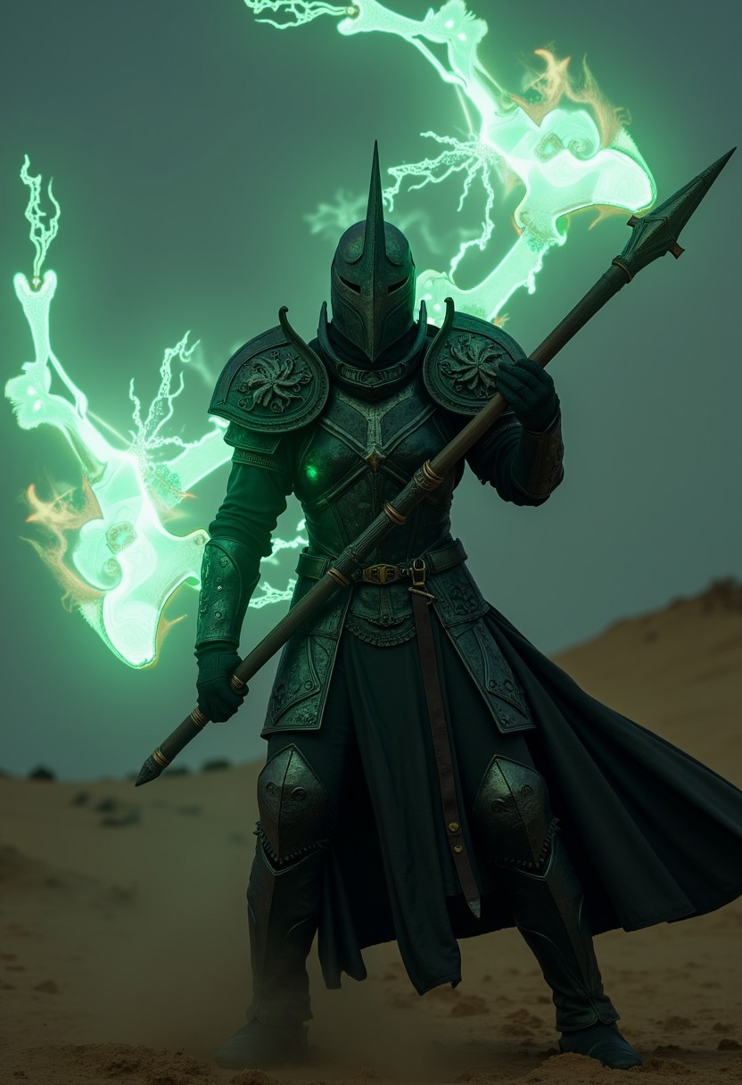 A dark fantasy action scene 6k movie stil-shot captures a dark, menacing towering 'warforged' knight in the heat of an intense, action-packed battle, reminiscent cinematic movie-still-shot using 6k dragon red camera. The knight’s intricately designed, battle-worn helmet reflects the eerie magical, ethereal glow of its weapon—a massive, glowing glaive. The blade crackles with dark energy, gathering ominously at its edge, where a glowing orb of faded pale green light pulses with immense, destructive power. This energy radiates along the glaive's handle, casting a glow that is reflected by the knight’s helmet and armor, creating stark contrasts between light and deep shadows. Wielding the glaive with both hands, the 'warforged' knight is fully focused on offense, the glow of its weapon only amplifying the surreal nature of the battle. The glow from the blade accentuates the intricate details of its armor, casting long shadows that flicker across the lone desert battlefield amidst the wilds.