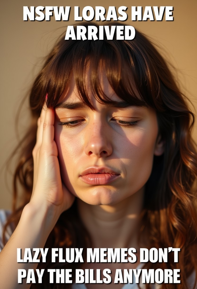 First world problems meme, realistic photo with captions, extreme closeup. -Floating english text at the top of the image says "NSFW LORAS HAVE ARRIVED" written in very big white letters, floating English text at the bottom of the image says "LAZY FLUX MEMES DON'T PAY THE BILLS ANYMORE" written in very big white letters. -The upset, sad woman has wavy brown hair with bangs, she has a hand pressed against her cheek and forehead, obscuring her right eye, and she is frowning. -Her eyes are closed, a thin line of tears is coming down from her left eye. -Face focus, golden hour, light tan background. She is not making eye contact with the camera. High resolution, not a render, not animated, not illustrated, not drawn.