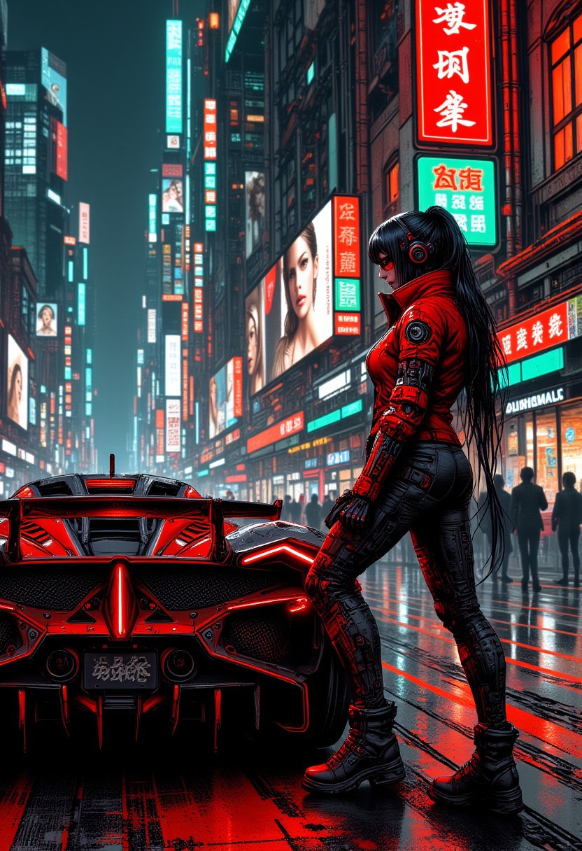 cyberpunk anime style, goth woman standing next to sci-fi supercar, parked on a cyberpunk street, with neon signs and large adverts featuring women, red and black colour theme