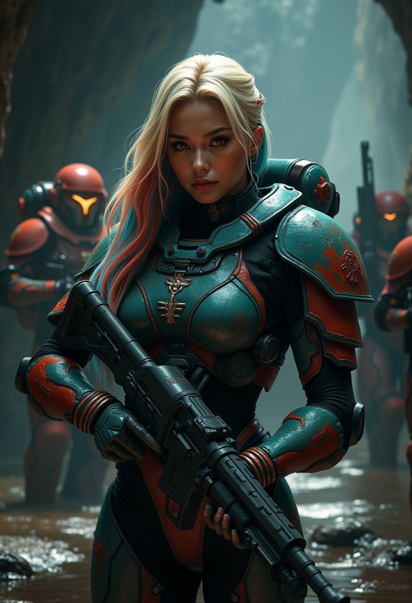 A female oriental space marine in teal and red power armour, long multicoloured loose hair (blonde with blue and red highlights), holding a large Plasma gun in a damp cave, other armed space marines behind her, realistic textures, ultra-high definition, photorealistic, highly detailed, dramatic lighting, sharp focus, cinematic, hyperrealism, dark and mysterious atmosphere, great lighting