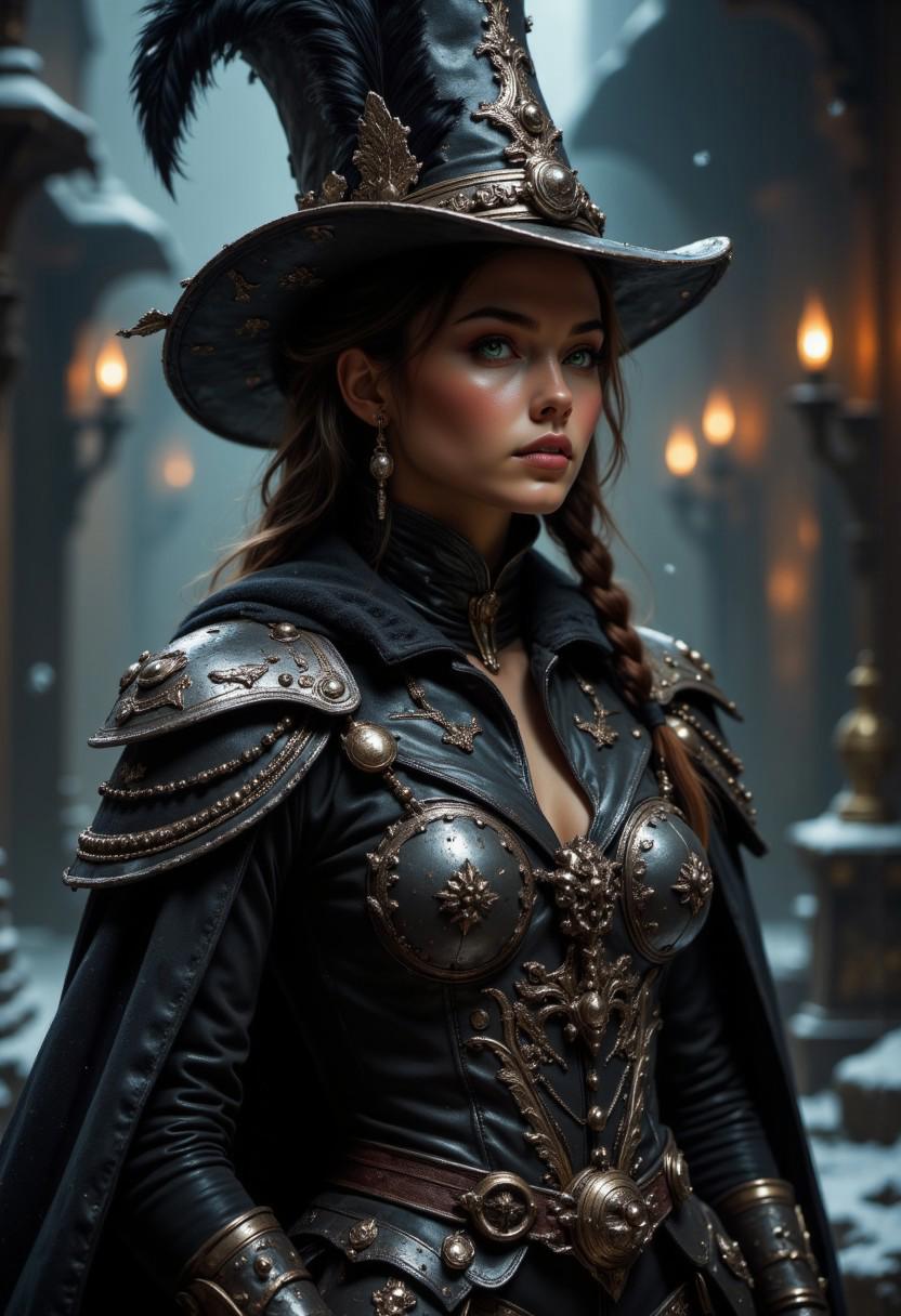 realistic style, 8k, exposure blend, medium shot, bokeh, (hdr:1.4), high contrast, (cinematic), (muted colors, dim colors, soothing tones:1.3), low saturation, (hyperdetailed:1.2), symetrical, octane render, 35mm, (intricate details:1.15), <lora:add_detail:0.8>, <lora:FujiVelvia50:0.4>, (black woman, ebony skin)+, adult (elven:0.7) woman, green eyes, light brown braided hairstyle, Style-GravityMagic, (style-rustmagic:0.8), portrait, looking away, solo, half shot, detailed background, ((DarkFantasy:0.8), dark fantasy theme:1.1), inquisitor, serious expression, silver trimmed elaborate intricate (studded:0.8) leather clothes, coat, cape, straps, belts, skull symbols, buckles, silver blade, shadowed face, imperial seal, flasks, large feather in hat, wide brimmed tall hat, chains, medieval guild hall, large room clutter, winter, occult atmosphere, dark lighting, shadows, warhammer dark fantasy, , aidmaimageupgrader, dark fantasy, eerie, horror